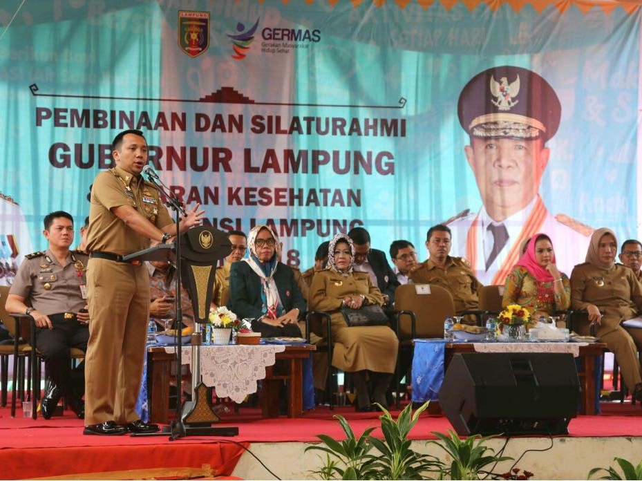 BANDAR LAMPUNG, Intailampung.com — Gubernur Lampung Muhammad Ridho Ficardo meminta seluruh jajaran Pemprov di bidang kesehatan berada di garda terdepan dalam palayanan kesehatan dan menciptakan Sumber Daya Manusia (SDM) Provinsi Lampung yang unggul, sehat dan kuat. Hal tersebut diungkapkan Gubernur saat memberikan sambutan pada acara Silaturahmi Gubernur Lampung dengan jajaran kesehatan se Provinsi Lampung, Senin (5/2/2018) di Mahan Agung.