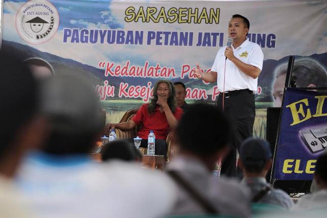 Calon Gubernur Lampung M Ridho Ficardo, ditunjuk langsung oleh warga Desa Karang Anyar, untuk menjadi pembicara pada kegiatan sarasehan Peguyuban Petani Jati Agung, Lampung Selatan, bersama Surono Danu, Rabu, (4/4/2018)