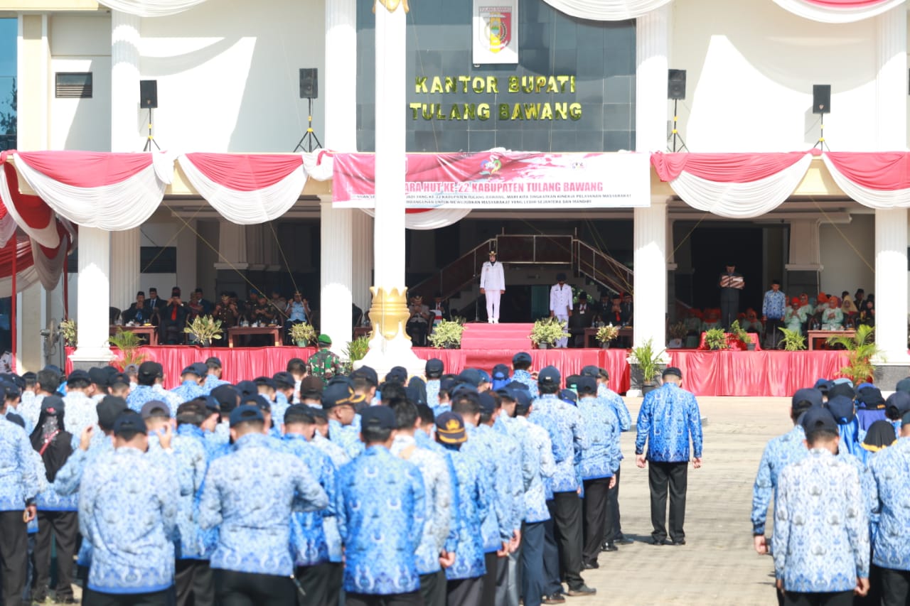 Dalam Upacara yang digelar di Halaman Kantor Pemda Tulangbawang tersebut, sebagai Pembina Upacara Bupati Tulangbawang Hj. Winarti SE MH dan pada kesempatan ini juga dilakukan penyerahan penghargaan berupa Satya Lencana Karya Satya kepada 37 Aparatur Sipil Negara (ASN) dilingkup Pemkab Tulang Bawang sekaligus pemberian tali asih kepada para Veteran.