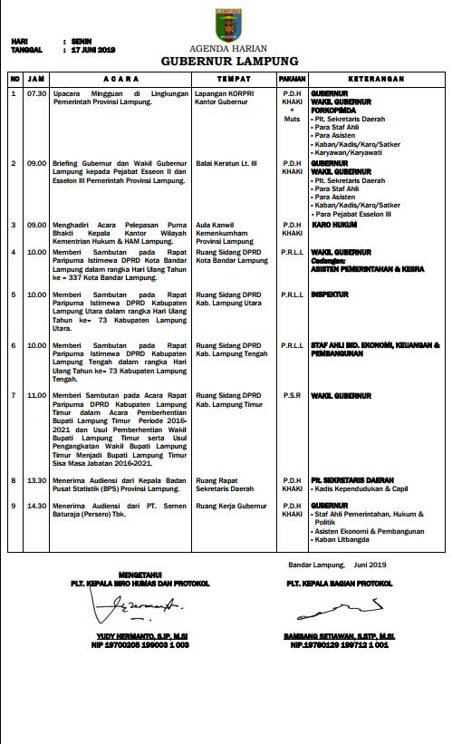 Sedangkan yang menarik posisi Kepala Biro Humas dan Protokol yang sebelumnya dijabat Heriyansyah digantikan oleh Plt Yudi Hermanto. Hal itu terlihat dari agenda harian Gubenur Lampung, Senin 17 Juni 2019, dan posisi Kepala Bagian Protokol Biro Humas dan Protokol adalah Plt Bambang Setiawan.
