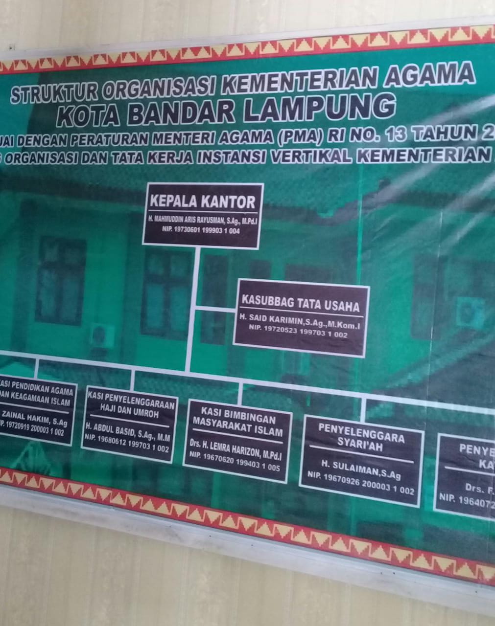 “Bapak Kemenag Mahmuddin Aris Rayuasman lagi keluar mas. Menghadiri pelantikan DPRD Kota Bandar Lampung,” kata staf Kemenag yang ada dilobi utama ini.