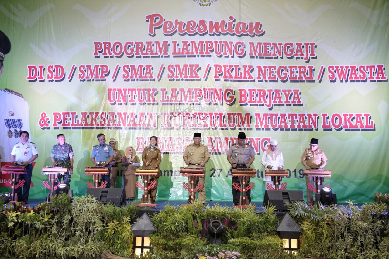 Bandar Lampung, Intailampung.com-Gubernur Lampung Arinal Djunaidi meresmikan Program Lampung Mengaji di SD/SMP/SMA/SMK/PKLK Negeri dan Swasta untuk Lampung Berjaya dan pelaksanaan kurikulum muatan lokal bahasa Lampung, di Gedung Bagas Raya, Bandarlampung, Selasa (27/8/2019).