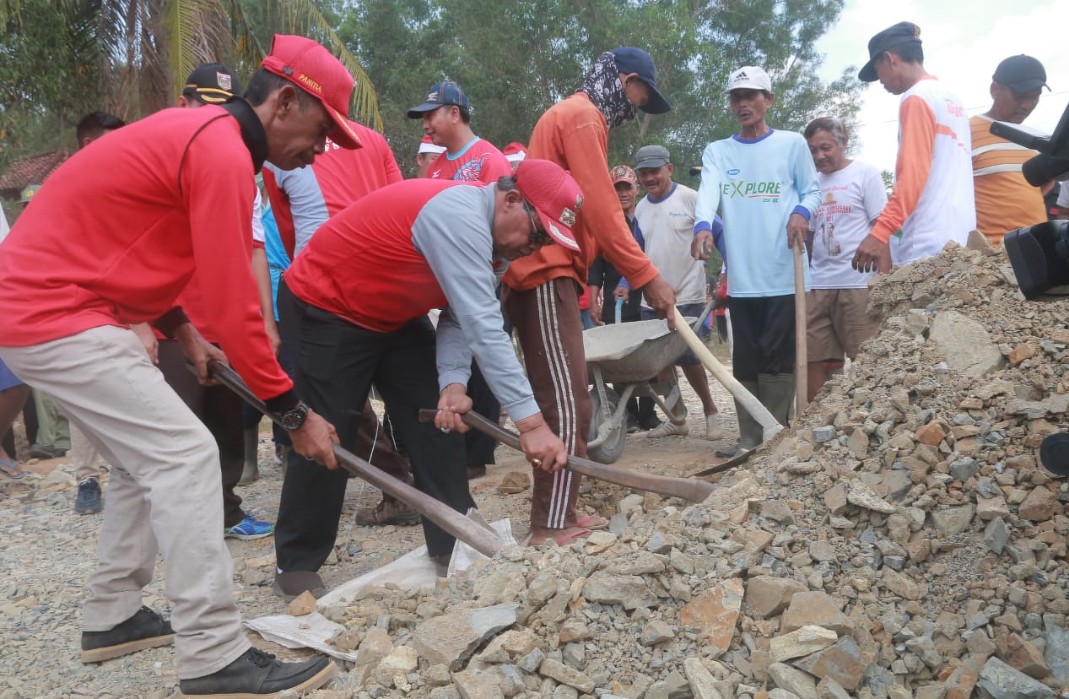 Untuk mempermudah kegiatan gotong royong, dari patauan Bupati Loekman menerjunkan dua alat berat, dan memberikan bantuan berupa material sabes untuk perbaiki jalan.