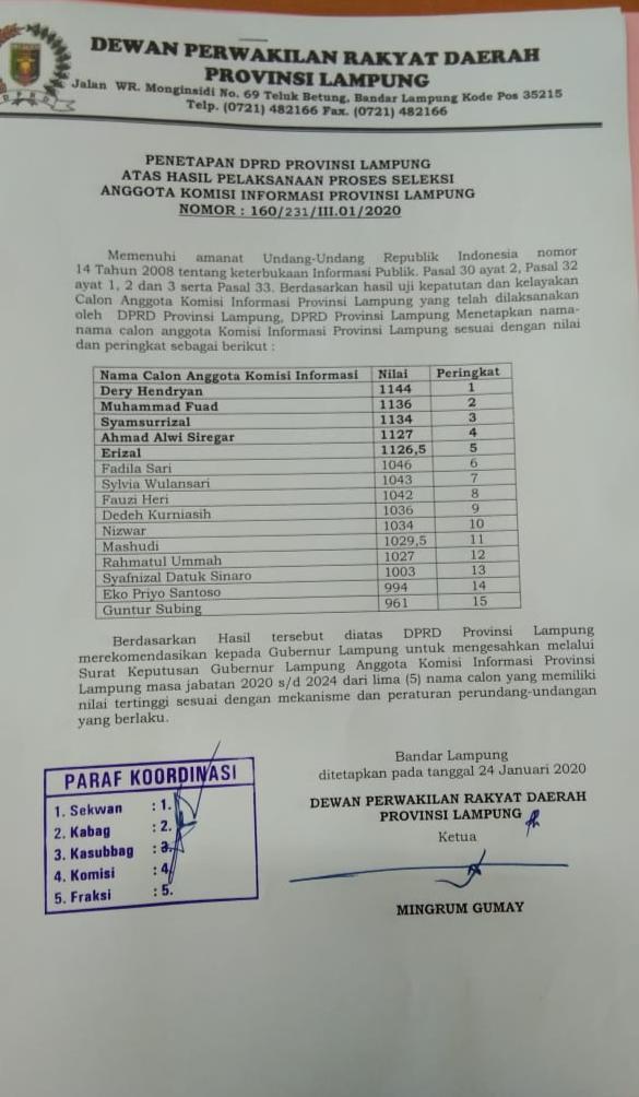Hasil Seleksi Anggota Komisi Informasi Lampung di DPRD Provinsi Lampung