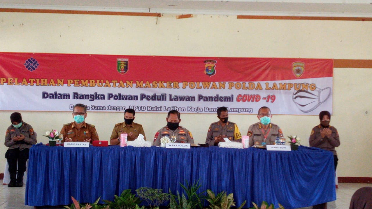 Bandar Lampung, Intailampung.com-Polda Lampung bersama Dinas Tenaga Kerja melalui UPTD Balai Latihan Kerja (BLK) Bandar Lampung melakukan pelatihan kepada polisi wanita (Polwan), dalam rangka pembuatan masker untuk masyarakat Lampung.