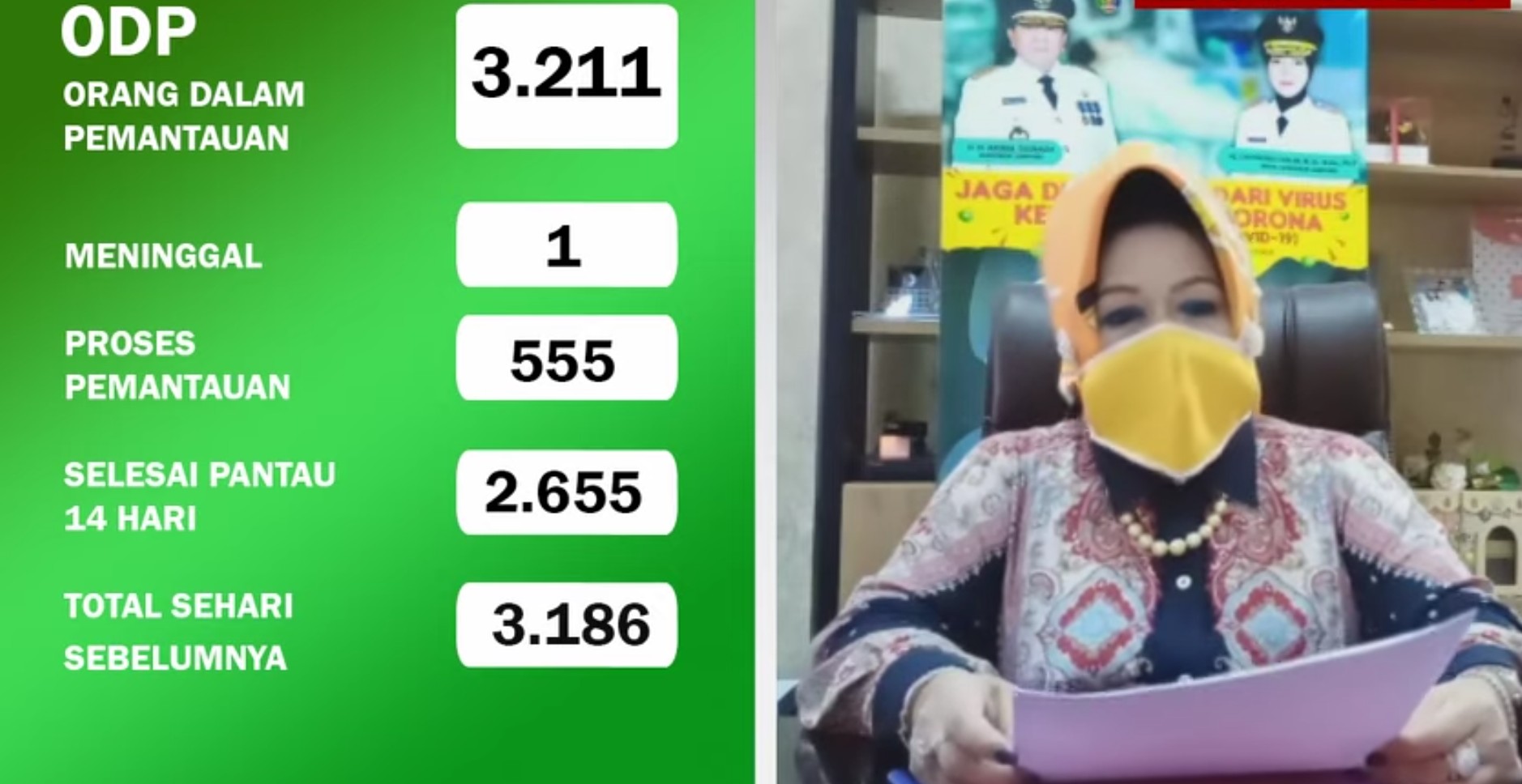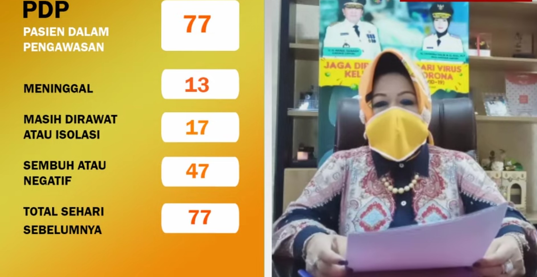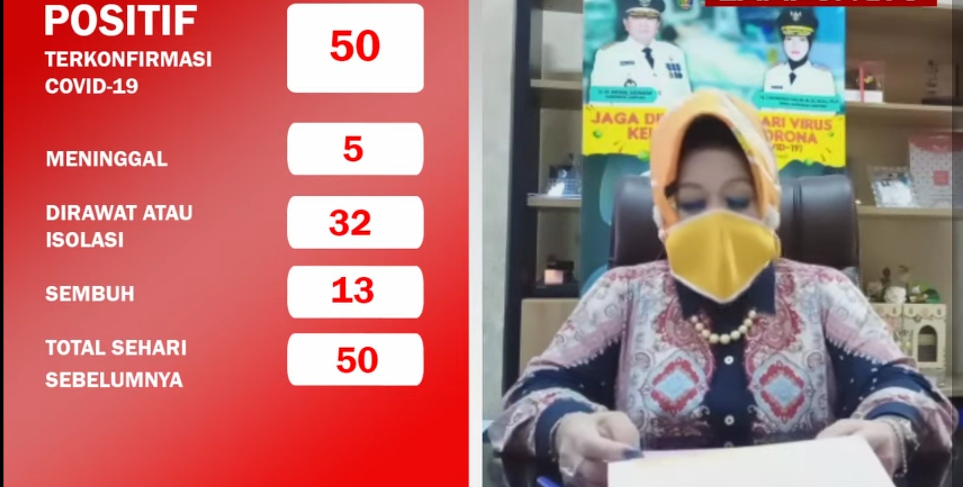 “Pada saat ini kasus kematian pasien konfirmasi positif Covid-19 berjumlah lima orang dengan total 50 orang pasien positif Covid-19,” kata Reihana melalui video yang dikirim ke WhatsApp Grup (WAG) resmi Covid-19 Provinsi Lampung, Sabtu (2/05/2020).