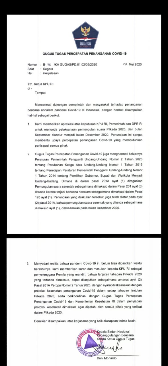 Dalam suratnya, Kepala Badan Nasional Penanggulangan Bencana (BNPB) selaku Ketua Gugus Tugas Percepatan Penanganan Covid-19, Doni Monardo, mengapresiasi keputusan KPU RI, Pemerintah, dan DPR RI untuk menunda pelaksanaan pemungutan suara Pilkada 2020, dari September menjadi Desember 2020.