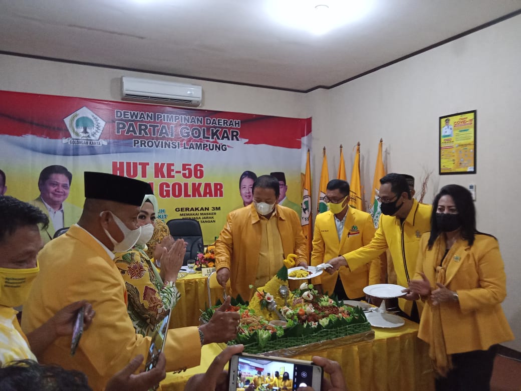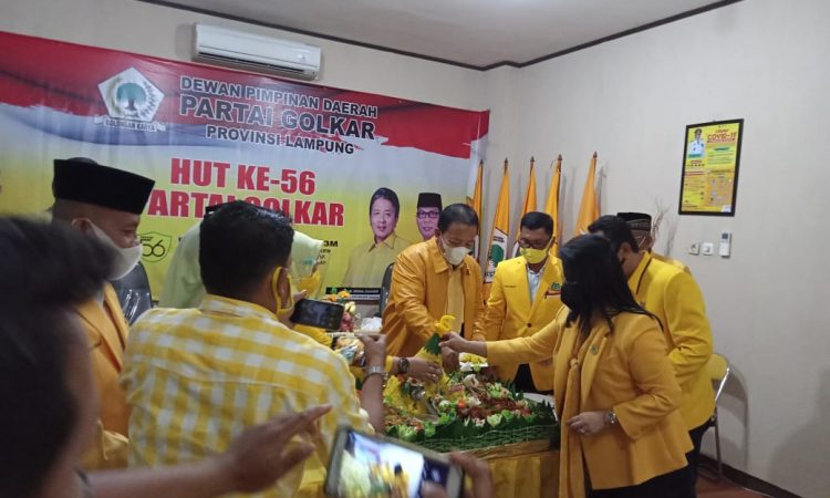 Sekretaris Golkar Lampung Ismet Roni mengatakan, pemotongan nasi tumpeng itu merupakan salah satu rangkaian HUT ke-56.