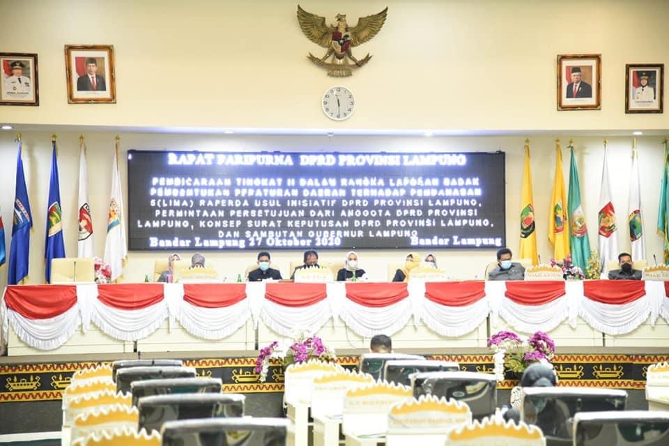 Bandar Lampung- DPRD Provinsi Lampung menggelar rapat paripurna dalam rangka pembicaraan tingkat II atas penetapan persetujuan terhadap 2 (dua) Raperda prakarsa Pemerintah Provinsi Lampung dan 5 (Lima) Raperda usul inisiatif DPRD Provinsi Lampung, Selasa, 27 Oktober 2020.