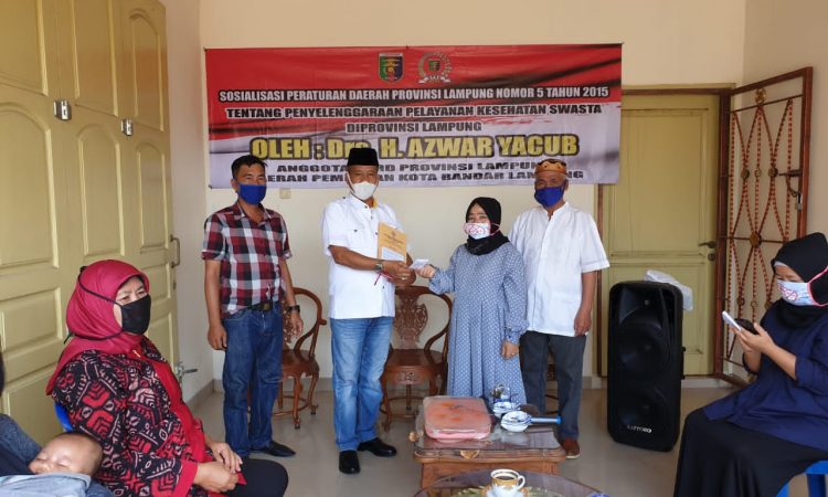 Intailampung.com-Anggota Dewan Perwakilan Rakyat Daerah (DPRD) provinsi Lampung, Azwar Yacub, menggelar sosialisasi Peraturan Daerah (Perda) Nomor 5 Tahun 2015. Meski dalam suasana pandemi Covid -19, nampaknya bukanlah halangan bagi politisi senior dari Fraksi Golkar ini melaksanakan tugas mulia sebagai wakil rakyat. Dengan mengedepankan protokol kesehatan, kegiatan sosialisasi Perda tentang penyelengaraan pelayanan kesehatan swasta di provinsi Lampung tersebut, digelar di Jalan M. Nur, Kelurahan Sepang Jaya, Kecamatan Lambuhan Raru, Kota Bandar Lampung. Jumat, 13 November 2020.