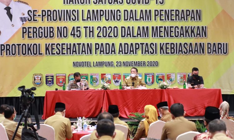 Bandar Lampung — Gubernur Lampung Arinal Djunaidi memimpin Rakor Satgas Covid-19 Se-Provinsi Lampung dalam Penerapan Pergub Nomor 45 Tahun 2020 dalam Menegakkan Protokol Kesehatan Pada Adaptasi Kebiasaan Baru, bertempat di Ballroom Novotel, Senin (23/11).