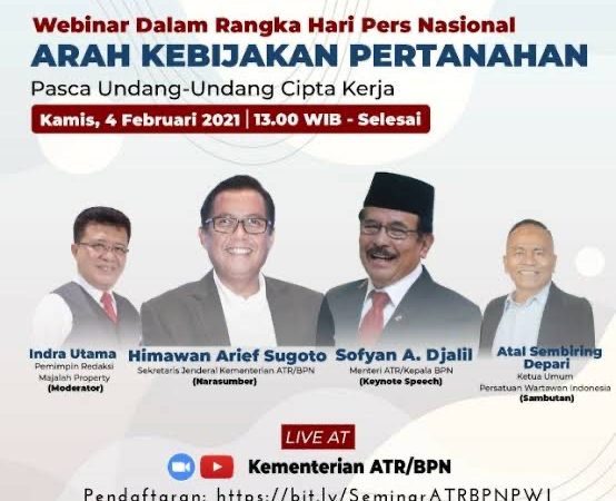Jakarta- Menteri Agraria dan Tata Ruang/Kepala Badan Pertanahan Nasional (ATR/BPN) Sofyan A. Djalil memberikan _keynote speech_ pada Webinar dengan tema Arah Kebijakan Pertanahan Pasca Undang-Undang Cipta Kerja yang dilaksanakan melalui _video conference_, Kamis (04/02/2021). Webinar ini diadakan oleh Persatuan Wartawan Indonesia (PWI) dalam rangkaian Hari Pers Nasional (HPN).