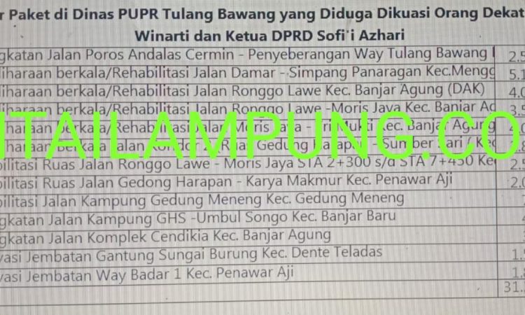 Padanya LSM Gerakan Masyarakat Pemantau Pembangunan Lampung (Gamapela) membongkar dugaan penguasaan paket proyek di sejumlah dinas di Kabupaten Tulangbawang oleh orang dekat Bupati Winarti dan Ketua DPRD Tuba Sopi’i Azhari.