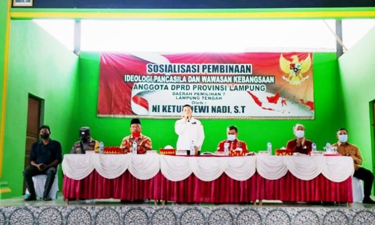 Bandar Lampung, Intailampung.com-Anggota Dewan Perwakilan Rakyat Daerah (DPRD) Provinsi Lampung Ni Ketut Dewi Nadi ST kembali turun ke dapil dalam rangka menggelar sosialisasi Pembinaan Ideologi Pancasila dan Wawasan Kebangsaan di Aula SMA Negeri Satu Seputih Mataram, Kecamatan Seputih Mataram, Minggu (10/10).