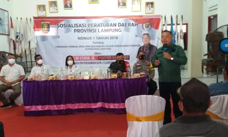 Bandar Lampung, Intailampung.com-Sekretaris Komisi II DPRD Lampung, Sahlan Syukur ingatkan bahwa Rembug Desa merupakan budaya bermasyarakat. Hal tersebut disampaikan dihadapan masyarakat Desa Mulyosari Kecamatan Tanjung Sari Kabupaten Lampung Selatan, melalui kegiatan Sosialisasi Perda Nomor 1 Tahun 2016, tentang pedoman Rembug Desa dan Kelurahan Dalam Pencegahan Konflik di Provinsi Lampung. Sabtu (12/02/2022).