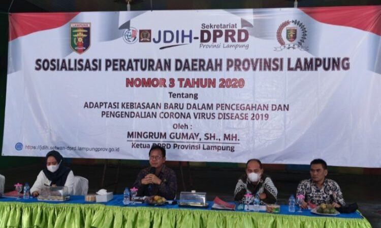 Bandar Lampung, Intailampung.com-Ketua DPRD Provinsi Lampung Mingrum Gumay SH., MH menggelar Sosialisasi Peraturan Daerah (Sosperda) Nomor 3 Tahun 2020 tentang adaptasi kebiasaan Baru (AKB) dalam rangka pencegahan dan pengendalian Covid 19 di kantor kelurahan Bandar Jaya Barat, Lampung Tengah, Rabu (11/05)