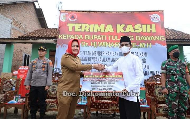 Total bantuan yang diberikan Bupati Tulang Bawang adalah senilai Rp.49.285.000.- juta rupiah untuk 78 KK yang terdampak bencana Alam Angin Puting Beliung.