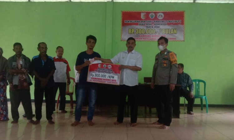 Melaksanakan Pembagian BLT bulan April, Mei, Juni. perbulan 300.000, Sebanyak 106 kepala keluarga penerima Manfaat (KPM) Rabu yang diterima masyarakat 900.000 kegiatan berlangsung diaula balai kampung Agung Jaya, Rabu, (16/06/2022).