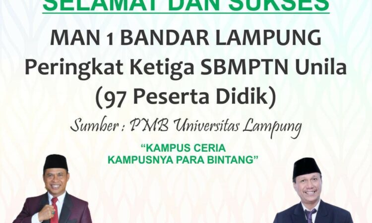 Bandar Lampung,Intailampung.com-Sebanyak 97 peserta didik MAN 1 Bandar Lampung dinyatakan lolos Ujian Tertulis Berbasis Komputer (UTBK) jalur Seleksi Bersama Masuk Perguruan Tinggi Negeri (SBMPTN) Universitas Negeri Lampung. Data tersebut berdasarkan sumber dari Humas Penerimaan Mahasiswa Baru (PMB) Universitas Lampung yang menyebutkan bahwa MAN 1 Bandar Lampung masuk peringkat ketiga dari 20 sekolah se-Provinsi Lampung yang lolos jalur SBMPTN di Unila.