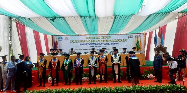 Intailampung.com, Tulang Bawang – Universitas Megou Pak Tulang Bawang (UMPTB) melakukan sidang senat terbuka, dalam rangka wisuda ke-VI program Sarjana (S1) tahun akademik 2021/2022. Kegiatan berlangsung dihalaman Gedung Rektorat UMPTB, Tiyuh Tohou, Kecamatan Menggala, Kabupaten Tulang Bawang.