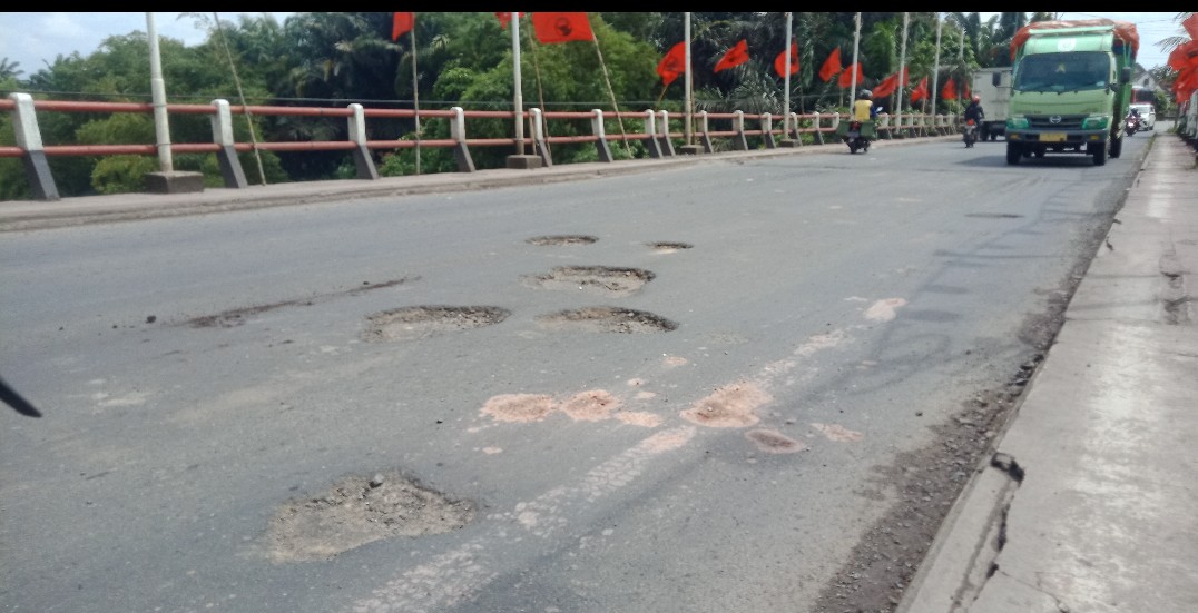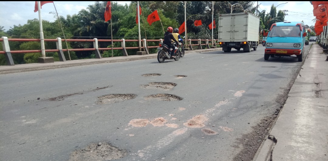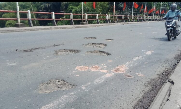 “Jalan berlubang di jembatan ini sangat membahayakan bang, karena lubangnya pas ditengah tengah, ini kalau pengendara tidak hati-hati, bisa bahaya. Bisa jatuh kecelakaan,” ungkapnya.
