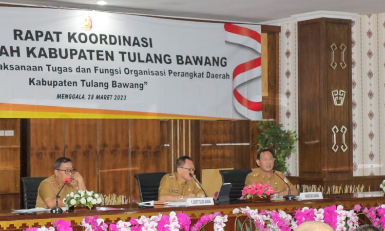 INTAILAMPUNG.COM – Di hari ke enam Ramadhan 1444 H, Penjabat (PJ) Bupati Tulang Bawang Drs Qudrotul Ikhwan, MM., menggelar Rapat koordinasi dalam rangka optimalisasi pelaksanaan tugas dan fungsi (tupoksi) organisasi perangkat daerah (OPD). Rapat diselenggarakan di Ruang Rapat Utama (RRU) Lantai 2 Setdakab Tulang Bawang, Selasa, 28 Maret 2023.