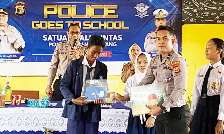 Intailampung.com, Tulang Bawang- Satuan Lalu Lintas (Sat Lantas) Polres Tulang Bawang, Polda Lampung, menggelar kegiatan Police Goes To School dengan sasaran para pelajar Sekolah Menengah Pertama (SMP) yang ada di wilayah hukumnya.