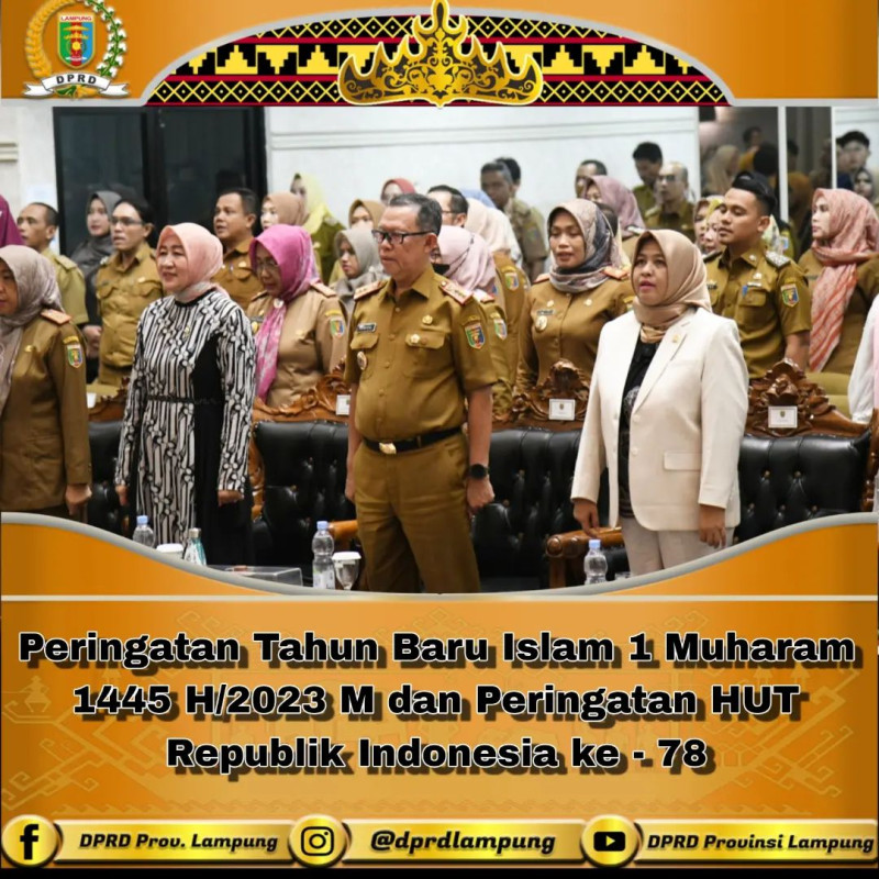 INTAILAMPUNG.COM – Anggota Komisi III DPRD Provinsi Lampung Nurhasanah menghadiri Acara Peringatan Tahun Baru Islam 1 Muharam 1445 H/2023 M dan Peringatan HUT Republik Indonesia ke-78 dengan tema Semangat Hijrah mewujudkan ASN Berakhlak, bertempat di Balai Keratun Lantai III, Komplek Kantor Gubernur, Senin (14/08/2023).
