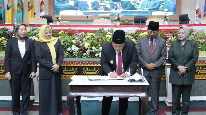 Penandatanganan disaksikan Wakil Ketua I dan Wakil Ketua II DPRD Provinsi Lampung dalam Paripurna Lanjutan di Ruang Sidang Paripurna DPRD Provinsi Lampung, Kamis (24/8/2023).