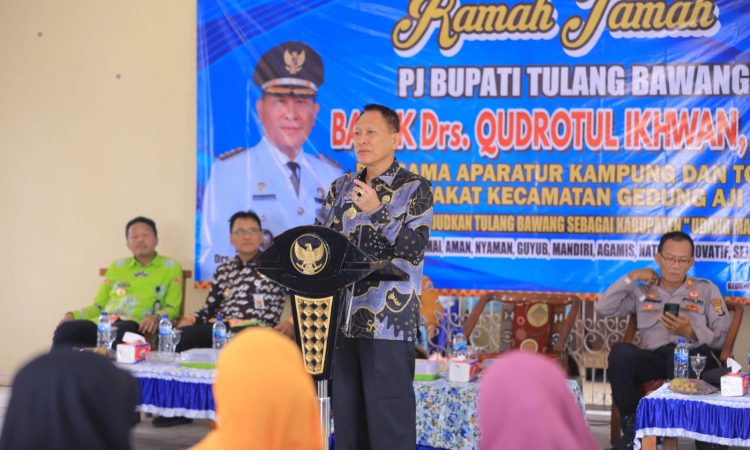 Sementara itu dalam kegiatan Ramah Tamah Bersama Aparatur Kampung & Tokoh Masyarakat di Kecamatan Gedung Aji Baru, Pj. Bupati Tulang Bawang menyampaikan kepada seluruh unsur lapisan masyarakat untuk bersinergi mewujudkan Kabupaten Tulang Bawang Sebagai Kabupaten Udang Manis (Unggul Damai Aman Nyaman Guyup Mandiri Agamis Natural Inovatif dan Sejahtera).