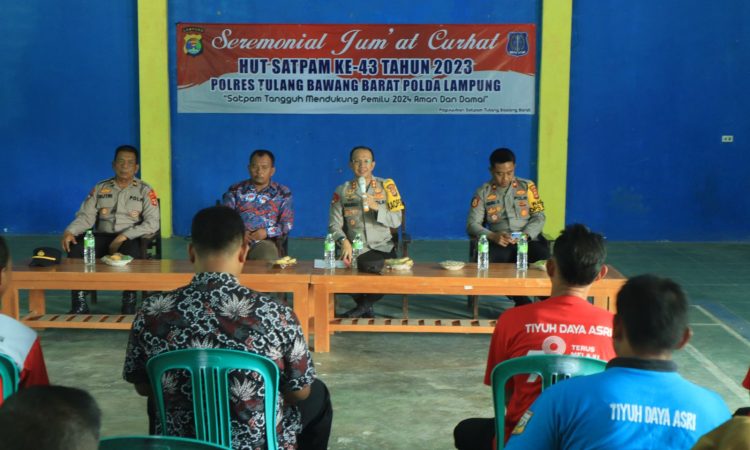 INTAILAMPUNG.COM, Tulang Bawang Barat- Kepolisian Resor Tulang Bawang Barat Polda Lampung menggelar kegiatan bertajuk Jum’at Curhat dengan mengambil tema “HUT Satpam Ke-43 Tahun 2023 dan Peningkatan Kompetensi Satpam Mendukung Pemilu 2024”, bertempat di Aula balqi tiyuh Daya asri, Hari Jum’at, (22/12/23) pagi.