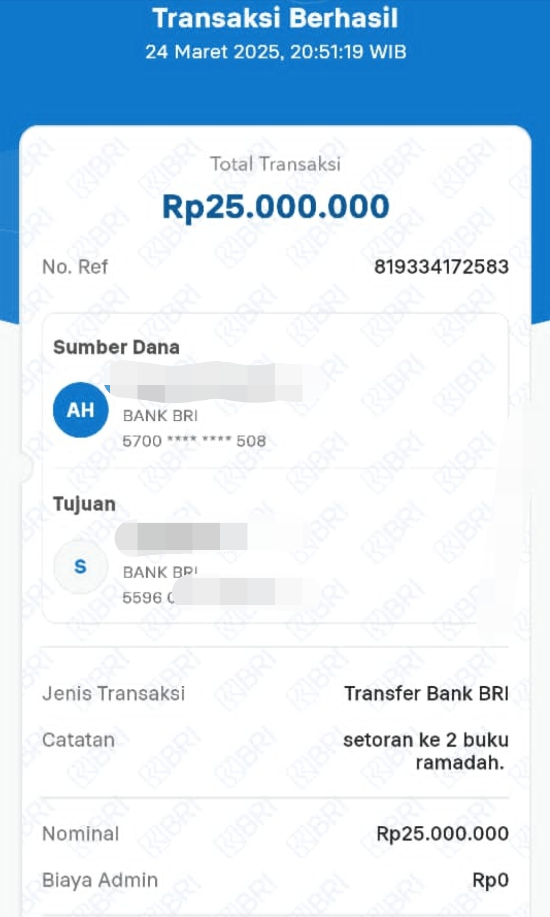 Yang tepatnya telah di kirim “A” melalui transfer rekening Bank BRI “S”, sebanyak dua kali di nomor rekening 5596 0102 0889 xxxx tanggal 24 Maret 2025.