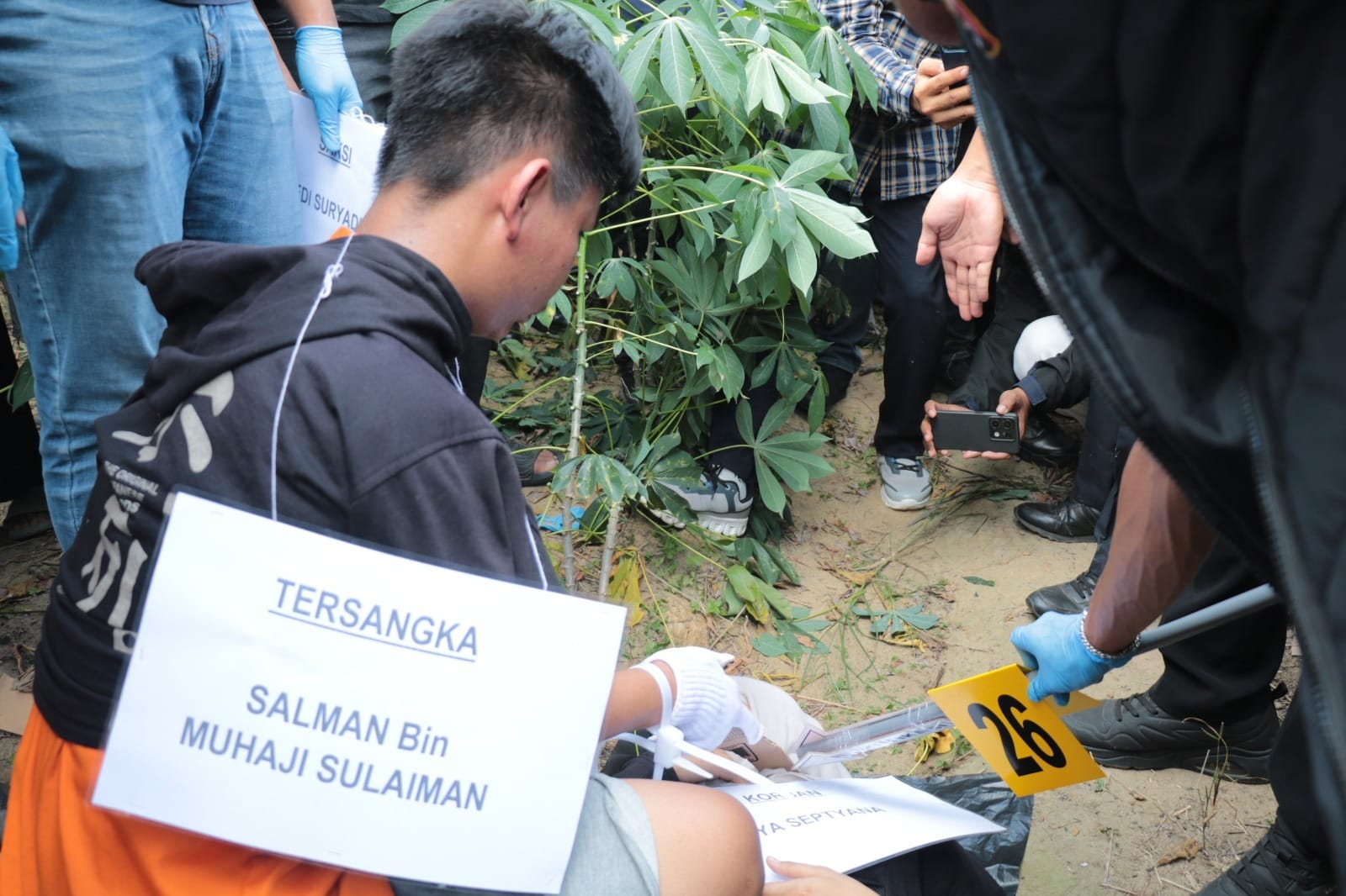 Lanjutnya, dalam rekonstruksi tersebut, tersangka Salman memperagakan 30 (tiga puluh) adegan mulai dari tersangka menjemput korban ke rumahnya, korban diantar cek kandungan ke klinik, hingga akhirnya korban meregang nyawa di kebun singkong yang berada di Kampung Tri Darma Wira Jaya.