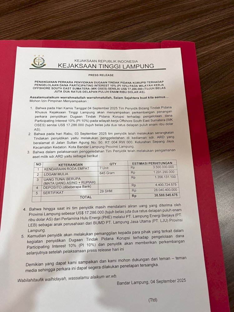 “Sehingga totalnya Rp 38.588.545.675,” jelas Aspidsus Kejati Lampung Armen Wijaya, saat konpres Kamis (4/9/2025) malam.