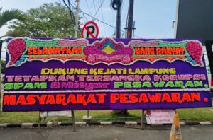 Bunga papan pertama bertuliskan, “Terima kasih Kejati Lampung atas telah diperiksanya Dendi Ramadhona kasus dugaan korupsi SPAM 8 miliar, mohon segera ditetapkan sebagai tersangka”.