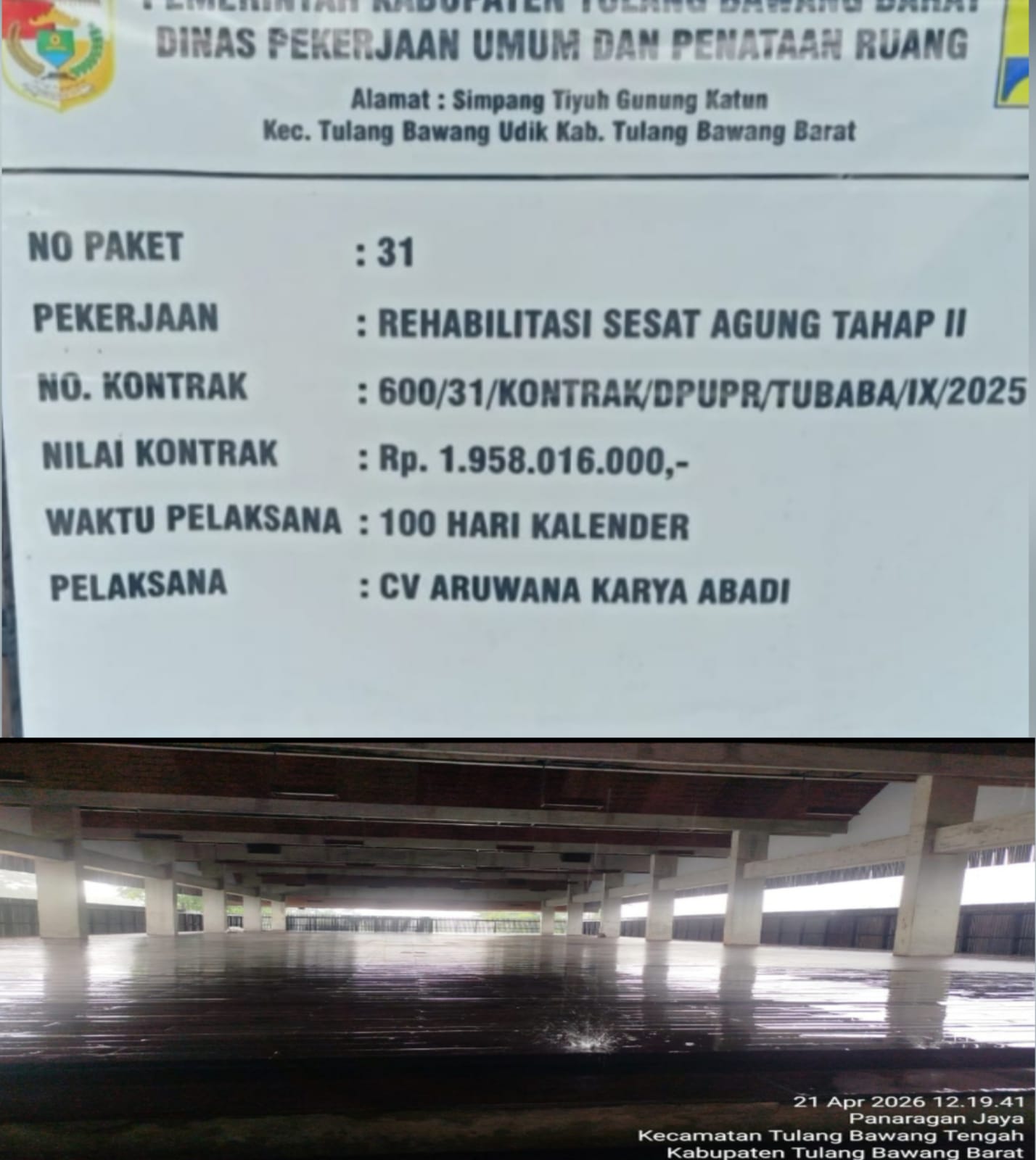 Data yang dihimpun menyebutkan, proyek tersebut menelan anggaran Rp1.985.016.000, dengan Nomor Kontrak 600/31/KONTRAK/DPUPR/TUBABA/IX/2025, dan dikerjakan oleh CV Aruwana Karya Abadi.