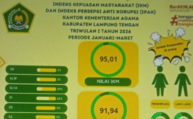 Selain itu, Kemenag Lamteng juga meraih Indeks Persepsi Anti Korupsi (IPAK), 91,94 (kategori A/Sangat Baik) pada 2026, dengan fokus peningkatan pada transparansi, kecepatan prosedur, dan sarana prasarana.